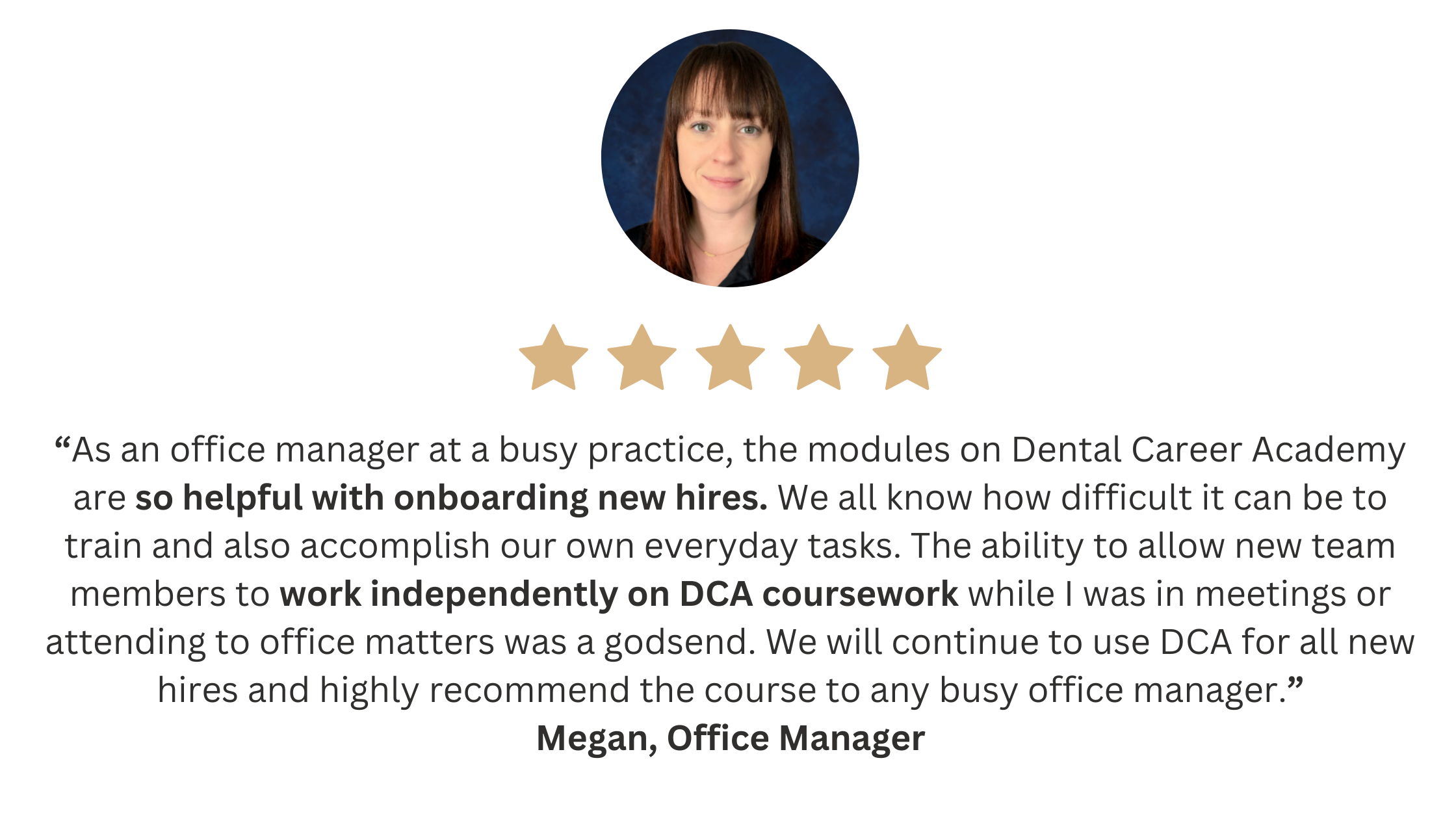 Whether you're growing quickly or just need a better onboarding system, Dental Career Academy gives you a plug-and-play solution to get new team members up to speed — without pulling your leads and office managers away from their own responsibilities. We offer courses forÂ